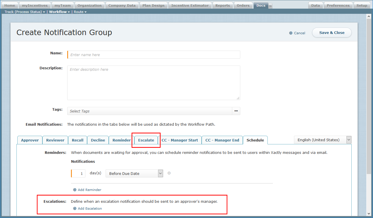 Xactly eDocs & Approvals 2018-04 introduces notification groups, a new way to customize and schedule email notifications that are sent during the document life cycle (accessible in the Docs > Workflow > Notifications area).