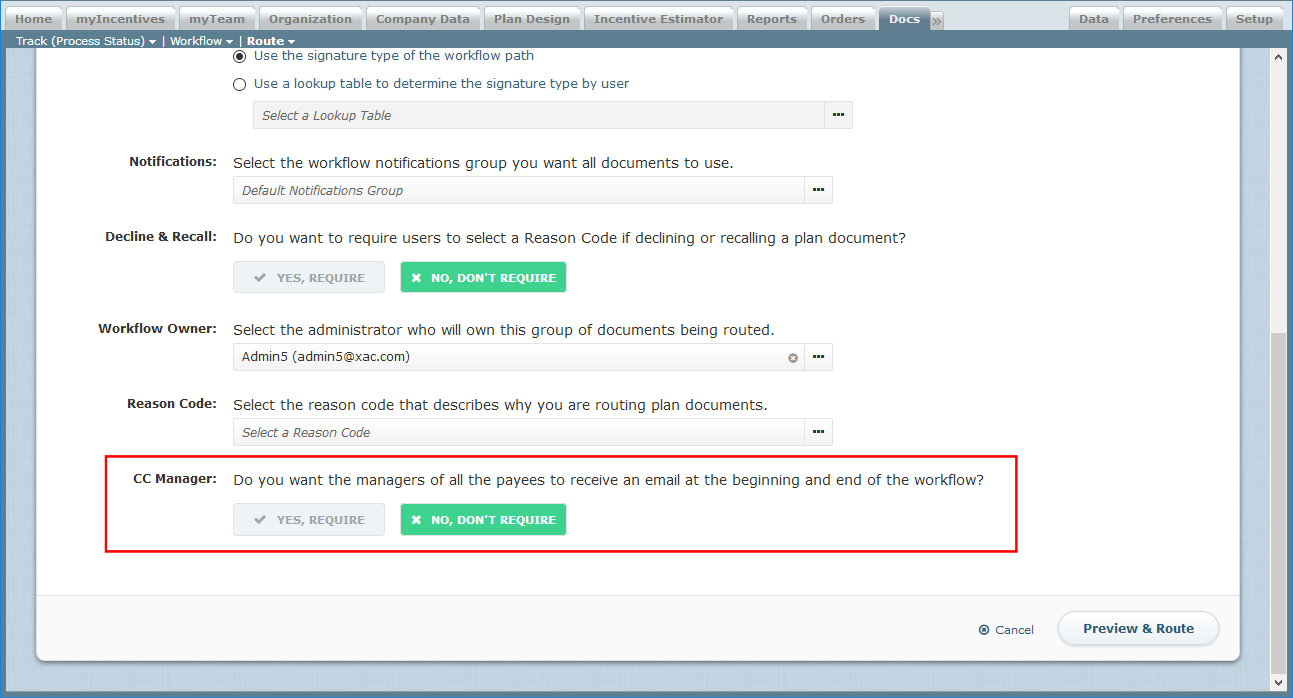 Xactly eDocs & Approvals 2018-04 introduces the ability for administrators to specify that managers of all payees receive an email at the beginning and end of the workflow (when routing documents using a routing group).