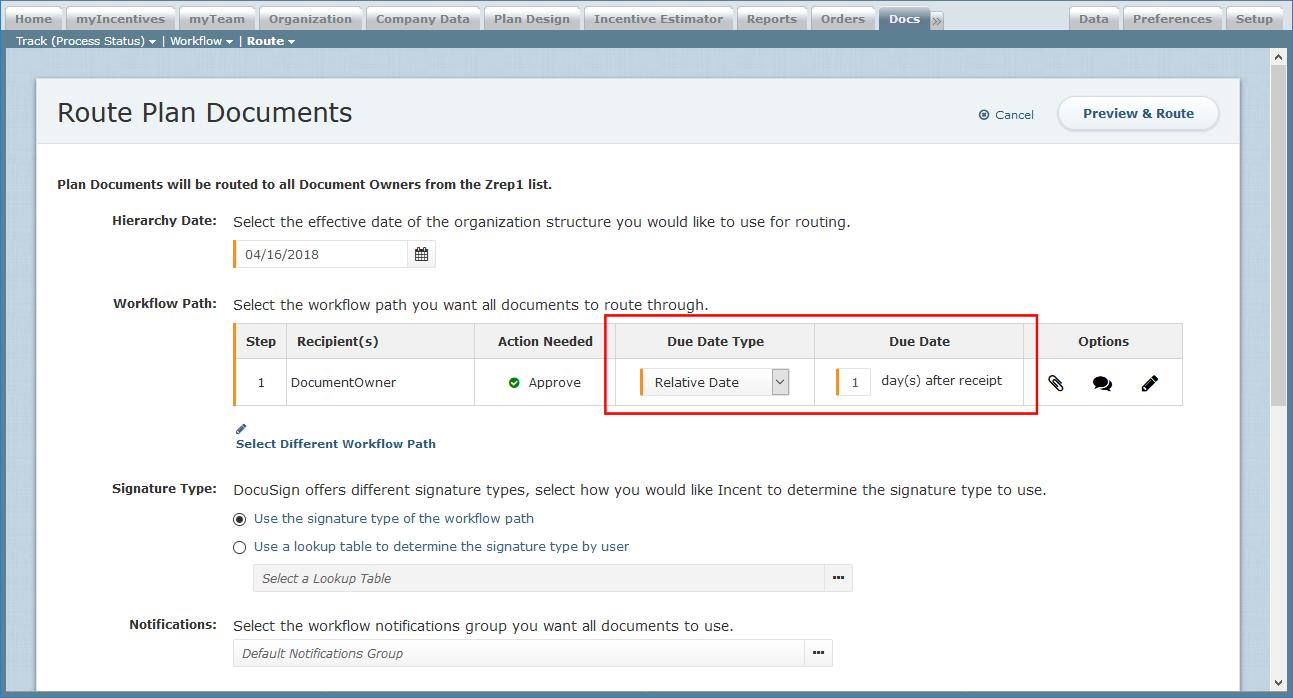 Xactly eDocs & Approvals 2018-04 adds the ability to specify due dates relative to the date of receipt in a workflow when routing plan documents.