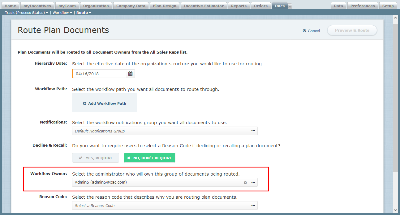 Xactly eDocs & Approvals 2018-04 introduces the ability to specify someone other than the initiator as the owner of a group of documents when routing plan documents in the Docs > Route > Route Documents by Person (Beta) area of the application.