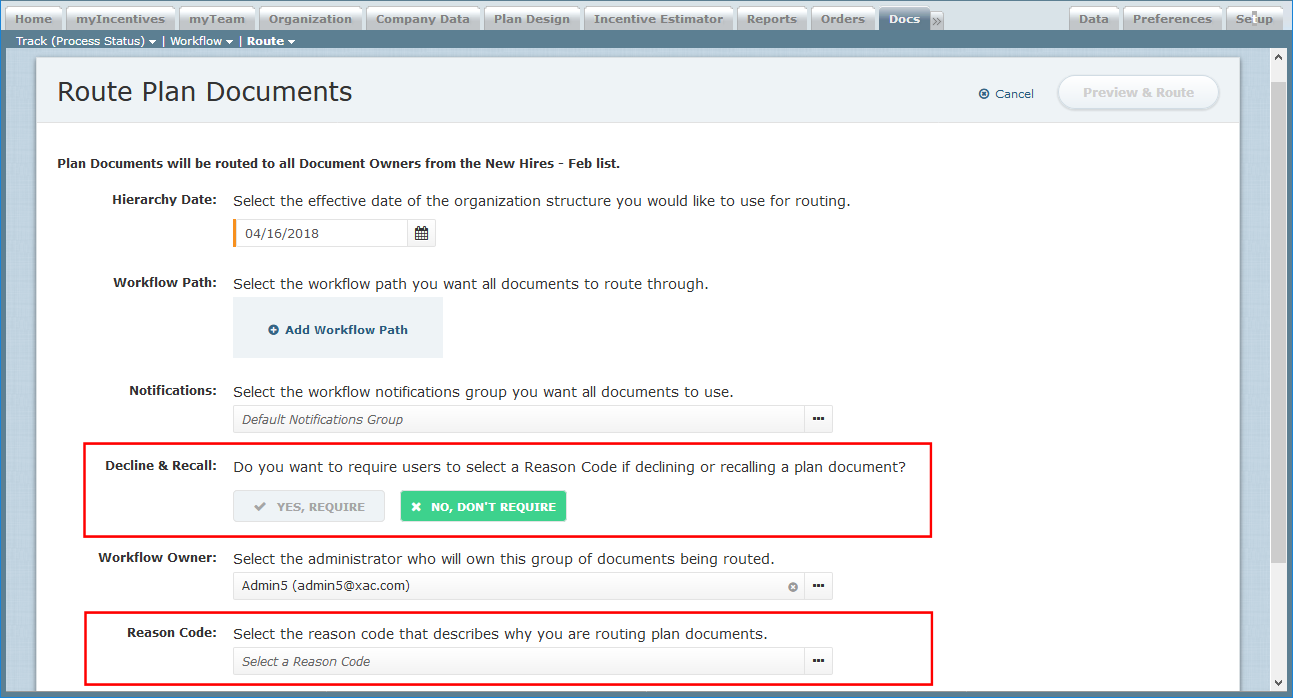 Xactly eDocs & Approvals 2018-04 adds the ability for administrators to specify whether a reason code is required when a user recalls or declines a document — in the Docs > Route > Route Documents by Person (Beta) area of the application.